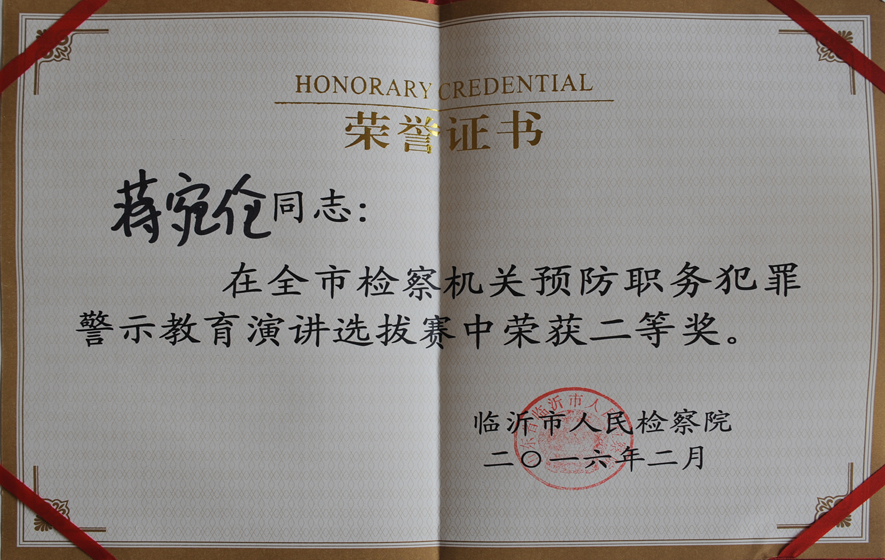 2月29日,在全市检察机关预防警示教育演讲选拔赛上,平邑县检察院职务犯罪预防科干警蒋宛伦同志二等奖,并被聘任为临沂市检察机关预防职务犯罪警示教育宣讲团成员。